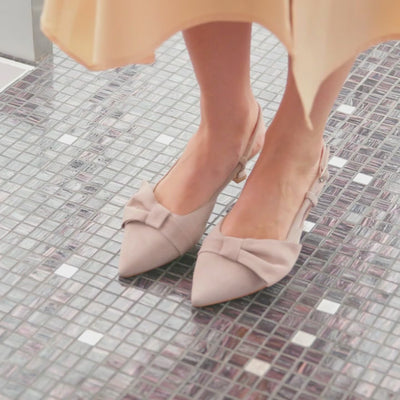 Our low slingback heels are here for the new season! Handmade from soft pale taupe suede with matching bows and a flared kitten heel for extra stability, 'Kennedy' is a classy neutral shoe with an elegant silhouette to go with all your favourite dressy outfits. With an adjustable slingback strap, underfoot cushioning and a stretch panel for bunions and difficult joints, these heels will give you hours of comfort!