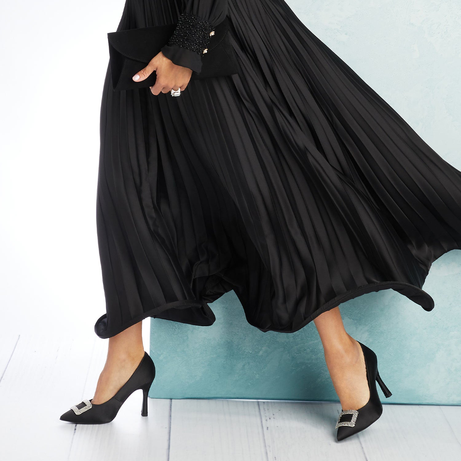 Introducing 'Prestige' in new sleek black satin! Elegant and feminine with an elongated silhouette and metallic buckle detailing, these powerful pumps transition seamlessly from professional settings to evening events. Featuring triple-layered underfoot cushioning, an arch support pillow and generous toe box, these are comfortable black high heels that offer height without the hurt!