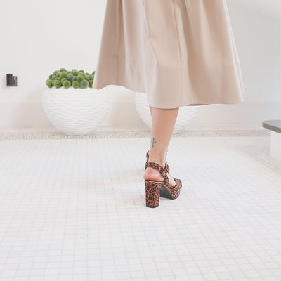 Unleash your party prowess with 'Ruby', now here in luxe leopard suede! A striking yet wearable neutral, this fierce heel elevates any look with sophisticated texture and timeless print. Handcrafted with a wide toe box and hidden stretch panel, these fashionable wide fit platform heels for bunions are the wardrobe wild card every woman needs!