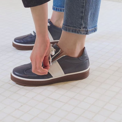 Step up in our new wide fit navy trainers! 'Uptown' is handcrafted in Italy from deep navy leather and features classic white side panels for a clean, retro-inspired look. The low rubber outsole in a practical dark brown tone offers reliable grip, finished with a crisp white trim. With a wide toe box, contoured cushioning, stretch panel for bunions and functional side zip, these trainers are an excellent choice for on-the-go feet that need extra comfort!
